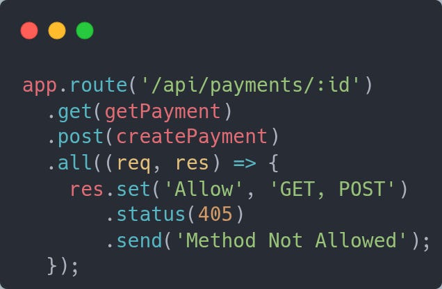 This is a small, but helpful change you can make to your APIs. If you encounter an error because someone sent a request to a valid address but an invalid method, your response should be 405 with a list of the methods you do accept.
