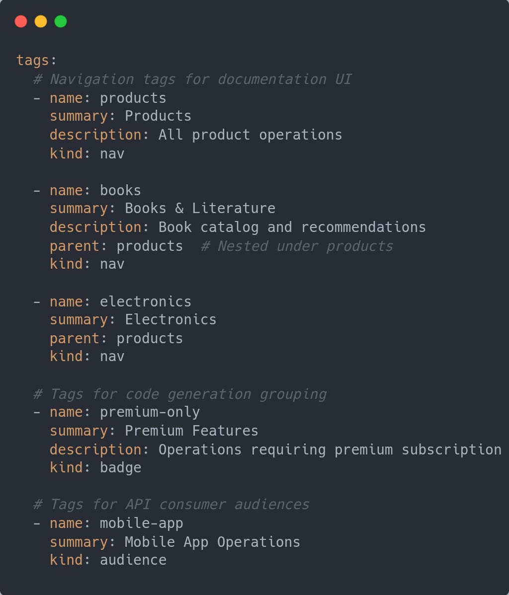 Multiple Taxonomies: Same API can have different organizational views without conflict (navigation structure vs. feature badges vs. target audiences)