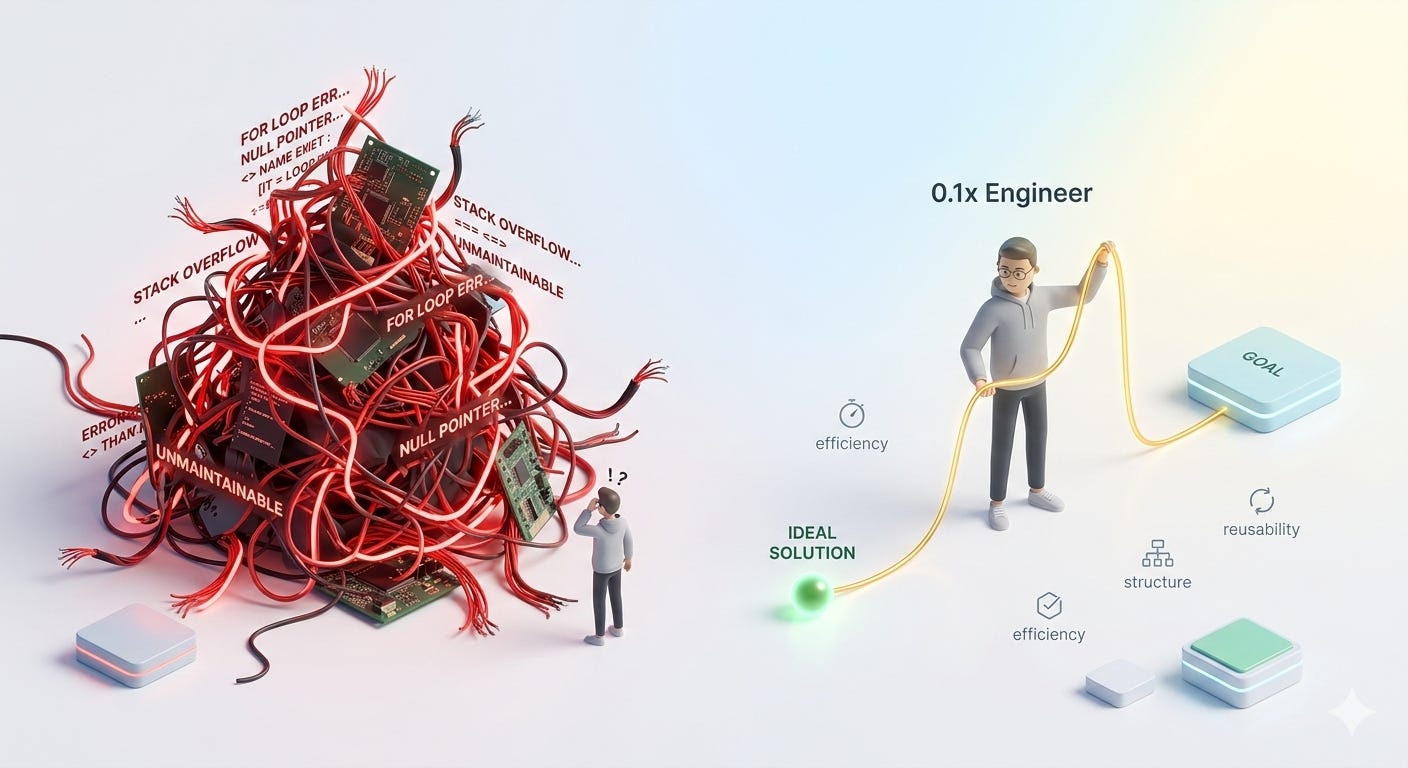 In this context, the 0.1x engineer is the one who can prompt to generate the least amount of code, while looking for reusability and maintainability.