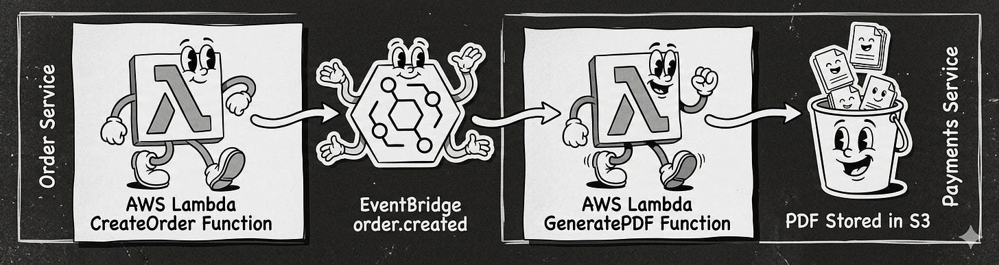 To test, you inject an Order Created to Event Bridge and assert the PDF was created.